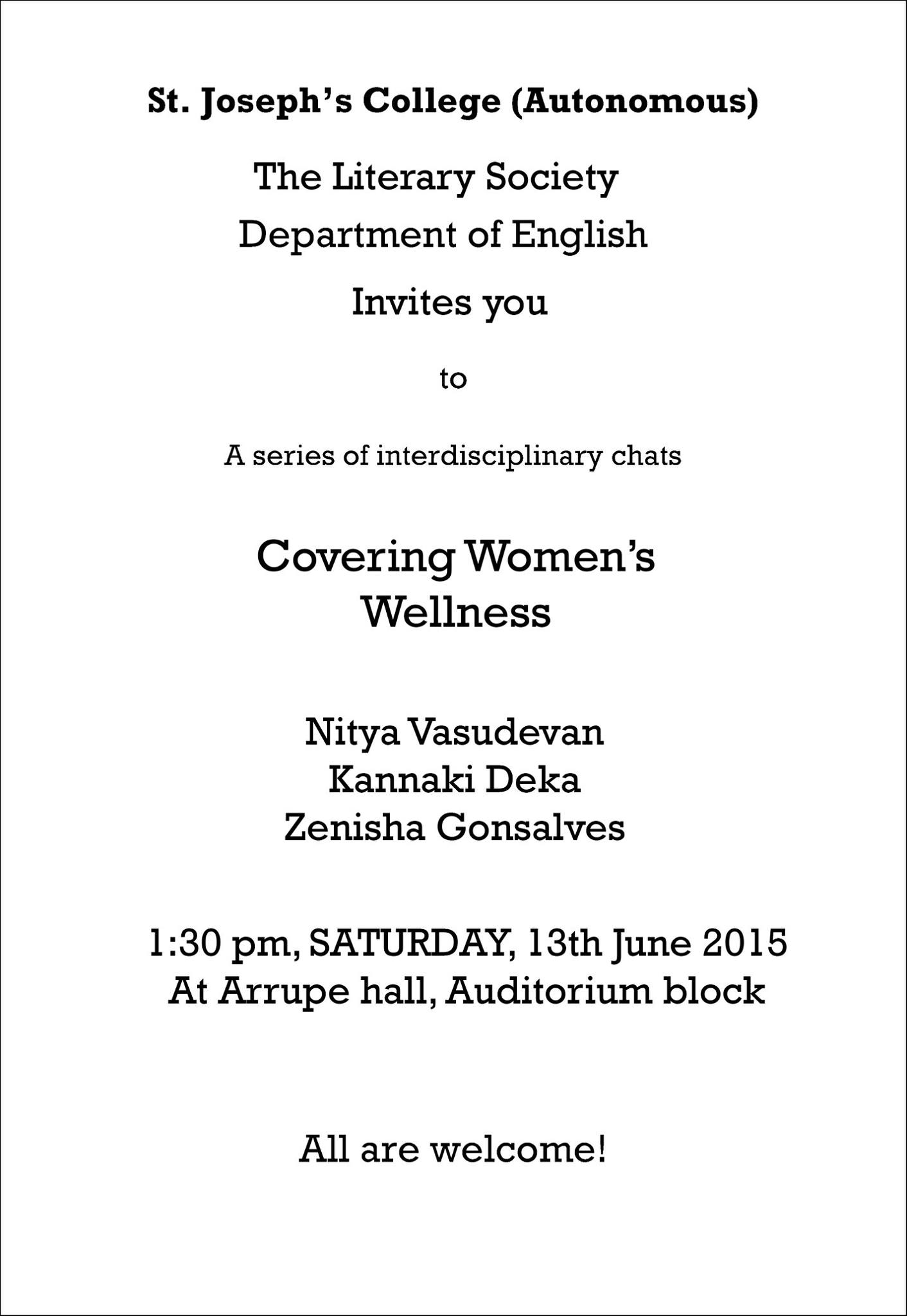 The inauguration of The Literary Society in St Joseph’s College (SJC), took place on 13 June with a conversation on women’s wellness. The panel comprised of Nitya Vasudevan, Kannaki Deka, and Zenisha Gonsalves. The moderator, Prof. Kannaki Deka, read an excerpt from the article, ‘Yes, Your Gynaec’s Thoo-Thoo Chee-Chee Prudery Can Ruin Your Health’, by Zenisha Gonsalves (3rd EJP, SJC), which was published on theladiesfinger.com on 2 June.