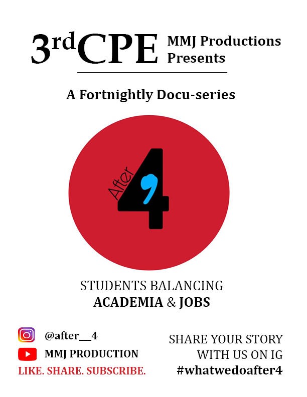 After 4 is a documentary series created by the students of 3rd CPE that aims to bring out the stories of students in St. Joseph’s College, Bangalore, who balance their academia and workmanship simultaneously.