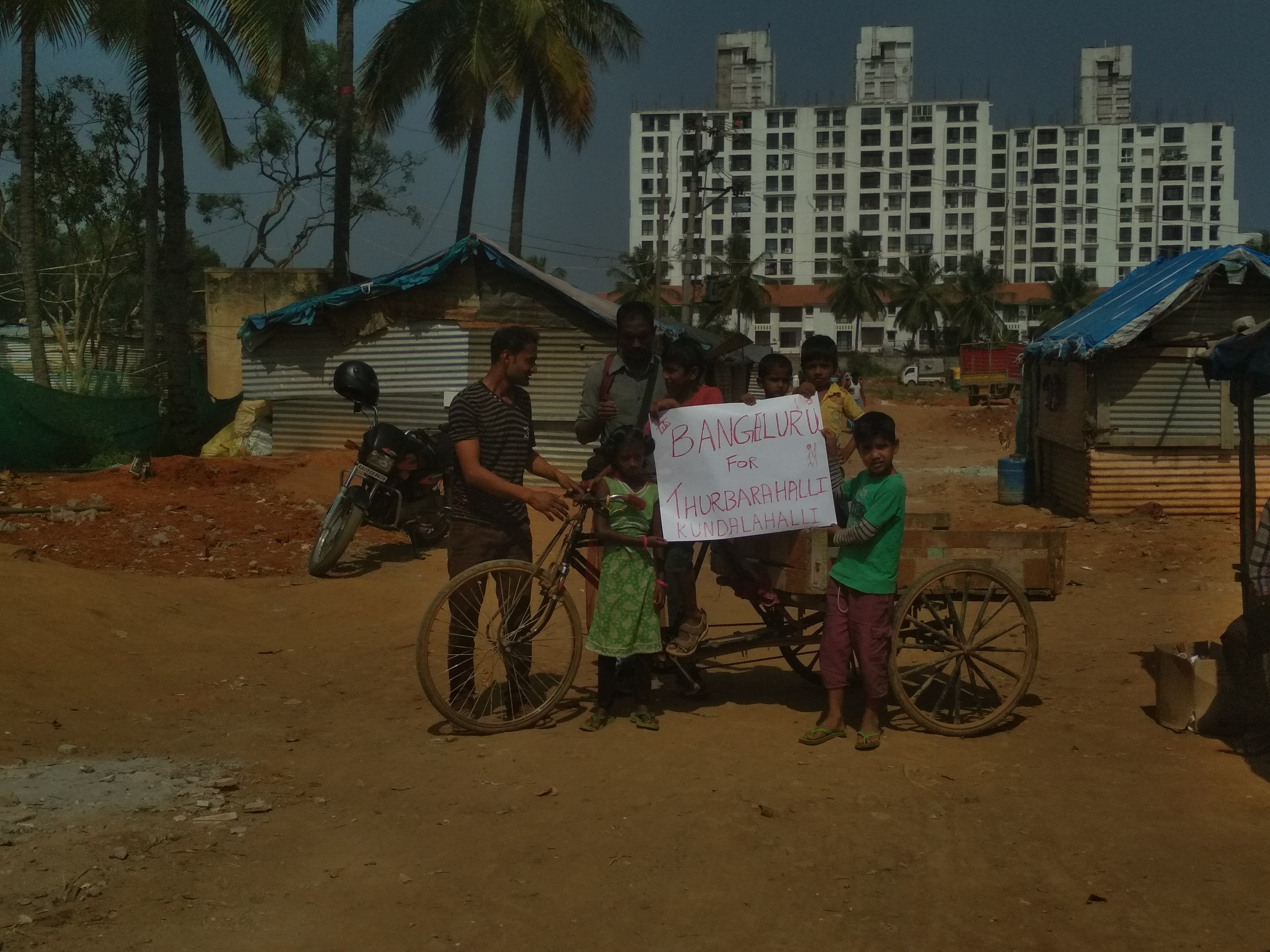 The settlements in Thubarahalli are a right turn away from the Varthur Main Road. The tarred road recedes, leaving behind the shiny complexes. Uneven muddy roads appear, lined with large apartment buildings and scattered sign boards for some International school.