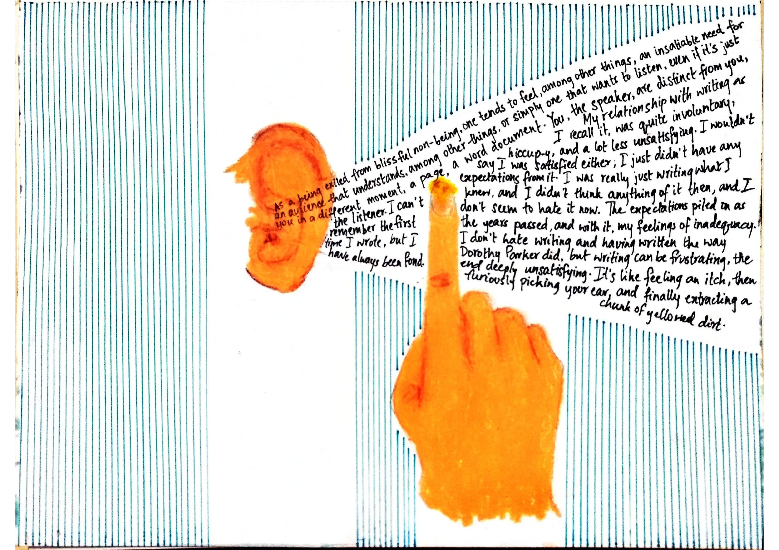 As a being exiled from blissful non-being, one tends to feel, among other things, an insatiable need for an audience that understands, or simply one that wants to listen, even if it’s just you in a different moment, a page, a word document. You, the speaker, are distinct from you, the listener. And sometimes you just loathe (or love) what’s going on in your head so much, you need to put in words, maybe read later, maybe get other people to endure the abstractions up there.