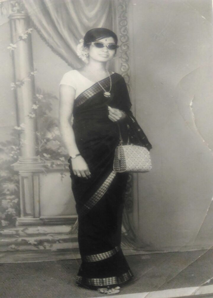 This photo reminds Ammamma of the few good days she had as an unmarried woman. It was taken at Vishnu photo studio near Magadi road on 7th January 1969. Everything she is wearing in this picture was bought with her own money. She is wearing a black sari with gold border, and her mother’s antique neck-piece.