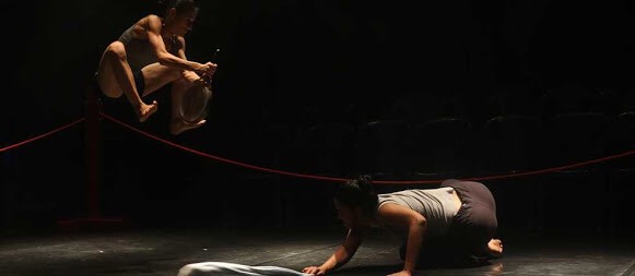 Sharanya and Ronita have this unnerving capability of pulling the audience into their stories so much that I have tunnel vision throughout. My eyes and head move in tune with each of their characters, not wanting to miss a second of it. The only time I wish I could look down is when Sharanya transforms into a proud, savarna dance teacher and Ronita a meek student, walking about, making comments on a few people seated around the ring. N’s anxiety of being commented/called upon become mine and I dread the spotlight as it moves closer to my side of the ring. She passes, thankfully, and sits herself down, beginning to recite a poem describing a woman. Ronita mimicks each line that described her body, with the “grace of a fish”, with “hips like the periphery of the earth”. As each stanza passes, the descriptions gets even more ridiculous, the spotlight continues to stay on the teacher, even as R’s body twists and turns beyond belief, twisting according to every whim of a man, who, I’m sure, is the only one capable of writing a poem as ridiculous as this. Her face grows dark with anger, her patience wavering, her movements beginning to vibrate with anger, to the point where, even after the teacher declared the performance over and left, the student vehemently stays on, “still as an archer’s arrow, unwavering”, before breaking momentum and turning into anger itself, leaping across spaces and minds, screaming “Am I good enough now?”