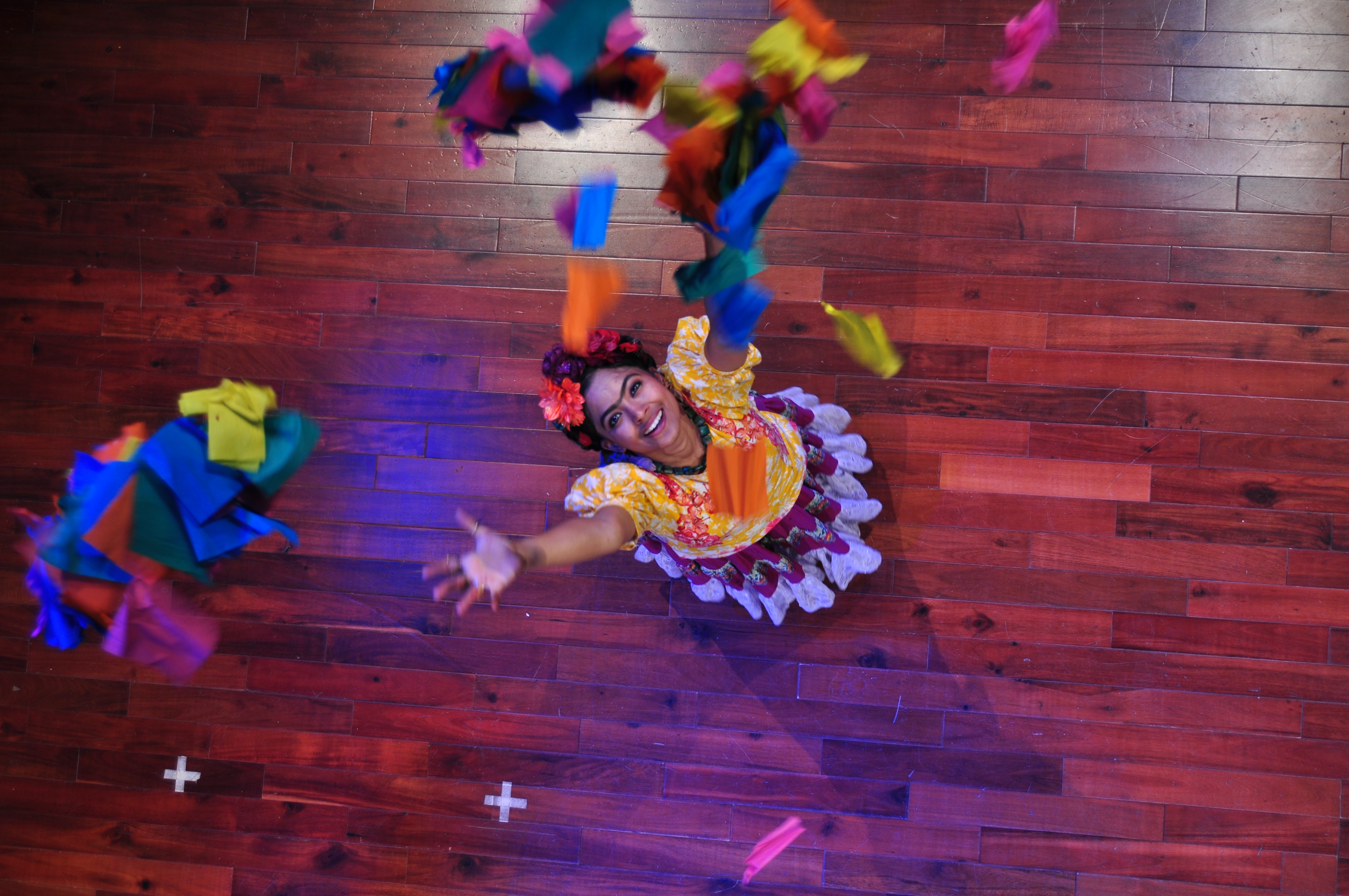 Soon after, Frida breaks into a song in Spanish, the words of which I’m unable to decipher but sound beautiful nevertheless. Frida moves from one point on the stage to another, her candy pink skirt covers her toes so it looks like she’s floating. The real Frida Kahlo hobbled due to various injuries, but in my head even her hobble is graceful.